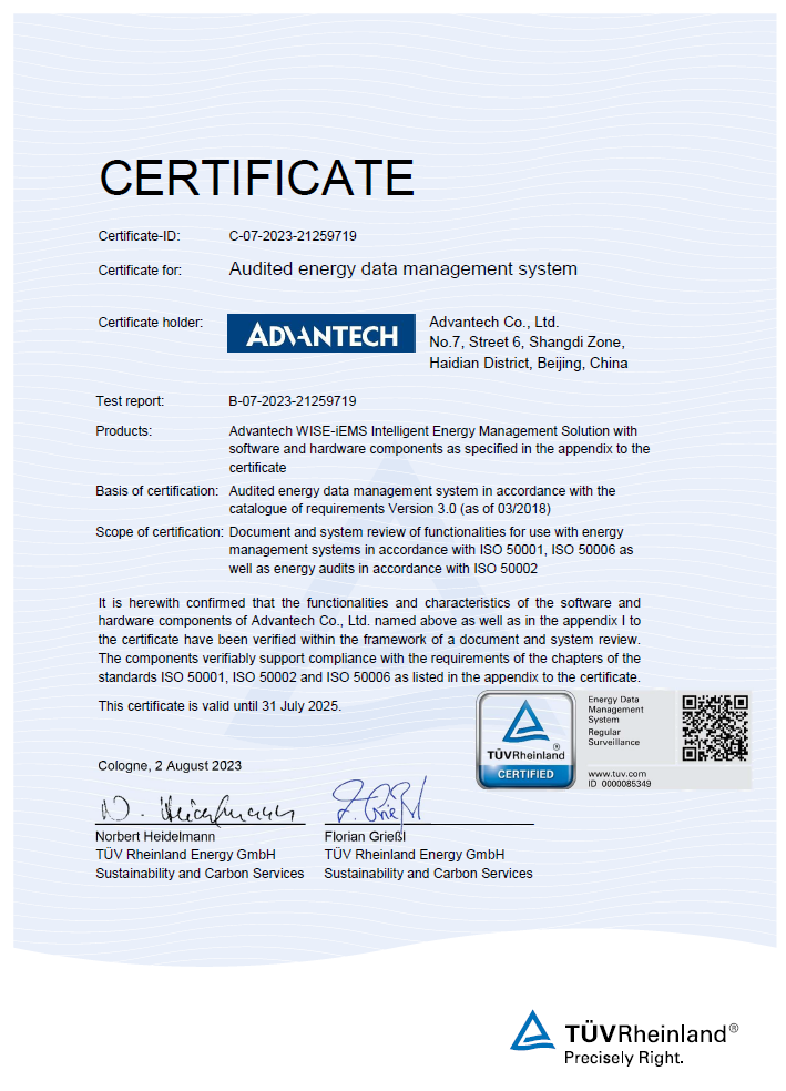 This certification demonstrates the strength and capability of iEMS/ECOWatch, which is comparable to the world's leading energy management products. It also highlights Advantech's commitment to innovation and product stability.